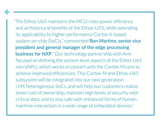 We’re already seeing great success with the Ethos-U55, as licensees including NXP Semiconductors deliver solutions that address the increasing demand for on-device ML processing for billions of small, power-constrained IoT and embedded devices. NXP will now also add the Ethos-U65 to its SoC offerings, providing their customers with more on-device intelligence for smarter, more powerful devices that benefit from high efficiency, greater privacy, and reliability.