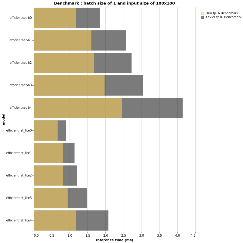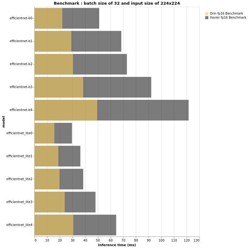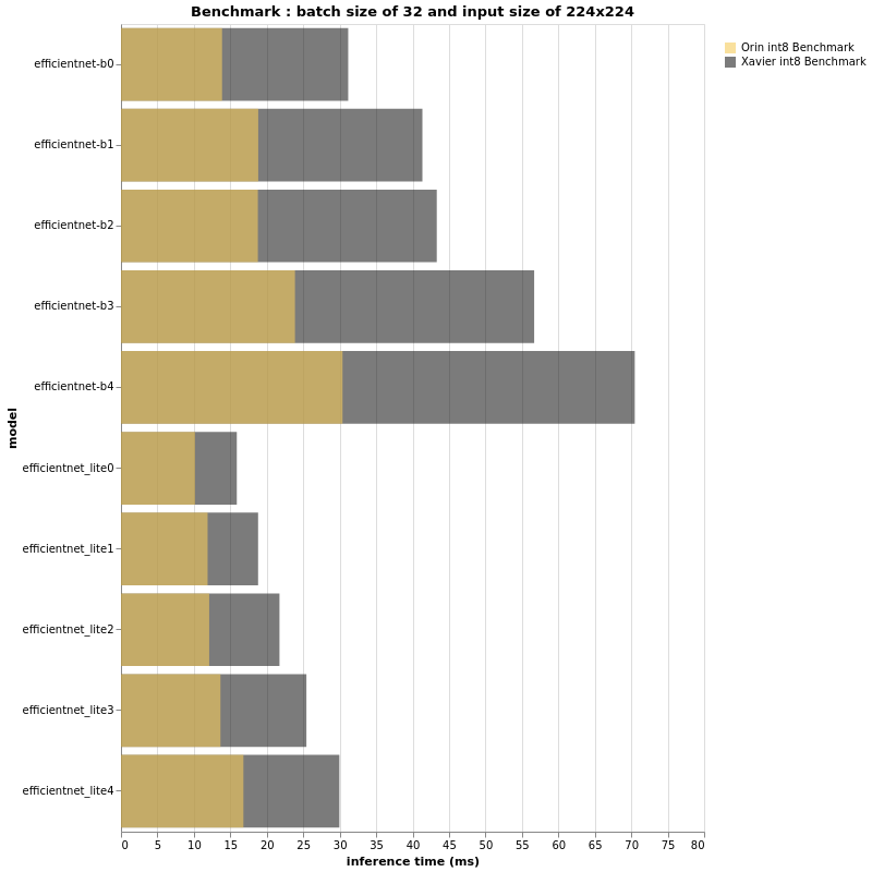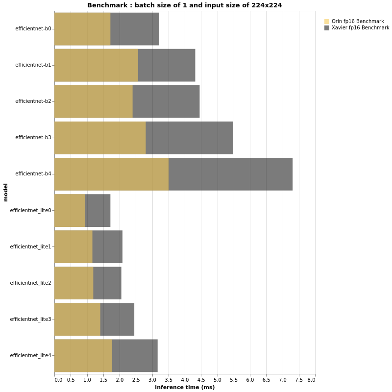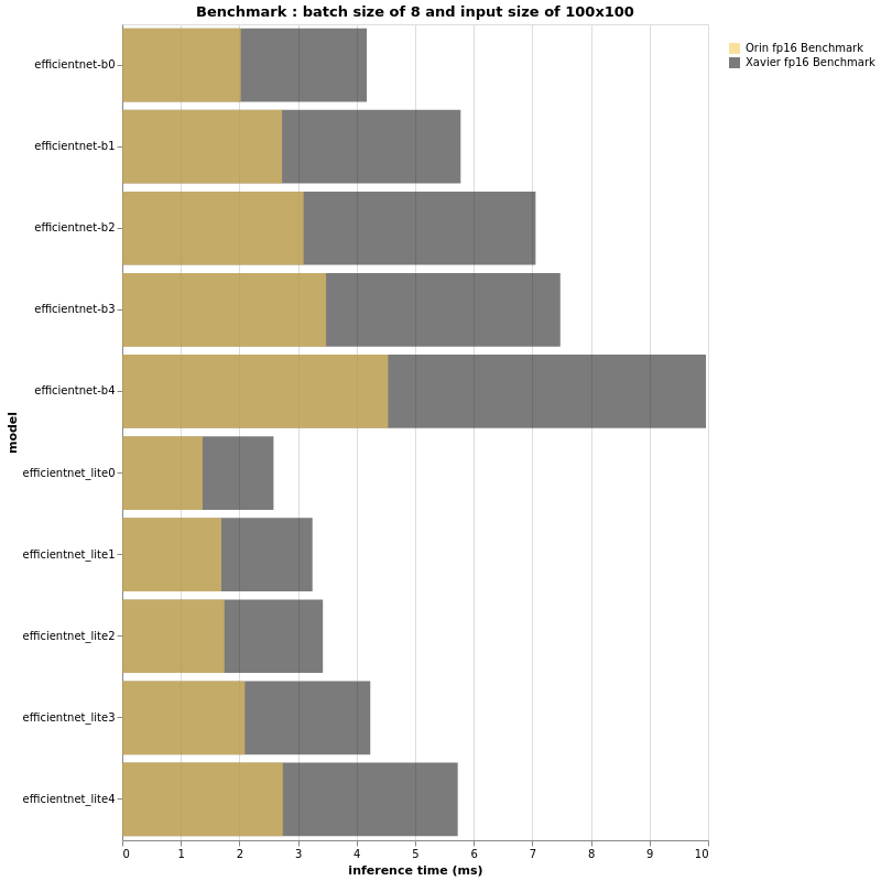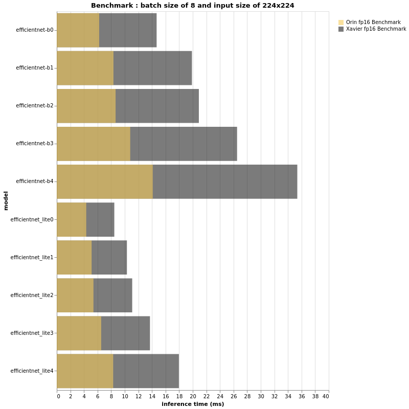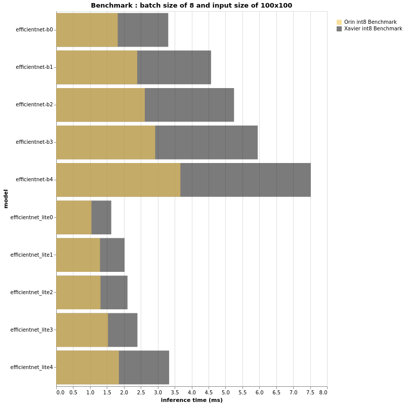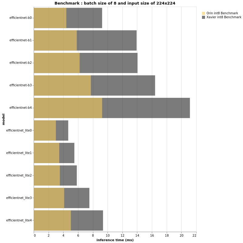 However on close observation if the performance ratio is roughly the same, the abscissa axis that measures the inference time is expected to be different, specifically when the batch size and/or the input size is bigger. For both fp16 and int8, the bigger the input size and batch size, the bigger the gap between Jetson AGX Xavier and Jetson AGX Orin.