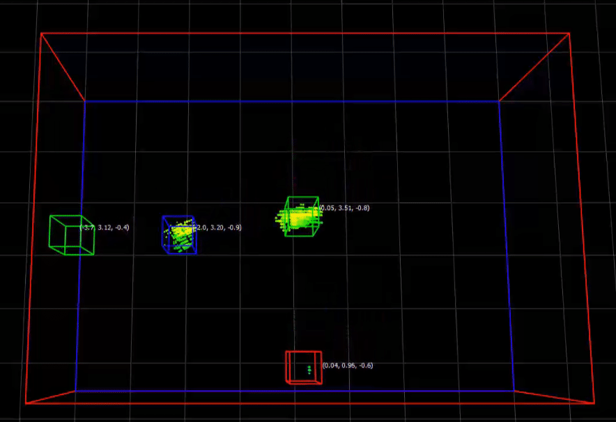 By comparing the millimeter wave receive signal against the transmit signal, we can use the frequency of peaks in the return energy to identify the range of objects in the scene. We can also analyze the phase of the signal across multiple transmissions to determine the Doppler speed of the objects. If we use multiple transmitters and receivers (Multiple-In/Multiple-Out or MIMO), we can identify the direction of arrival of the energy to pinpoint the azimuth and elevation of objects. With all this information, we build up a rich “point cloud” of returns. An example is shown the figure below. It’s called a point cloud because that’s just what it looks like when visualized. The points can further be “clustered” so that we can identify objects in the scene and their motion.