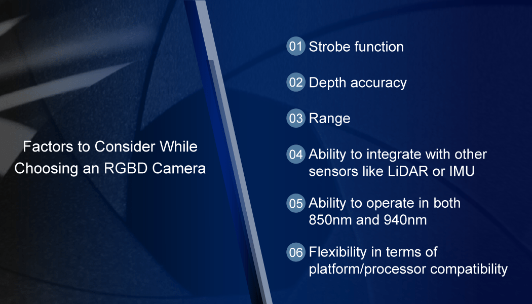 Further, keep a check on the following features while selecting an RGBD camera: