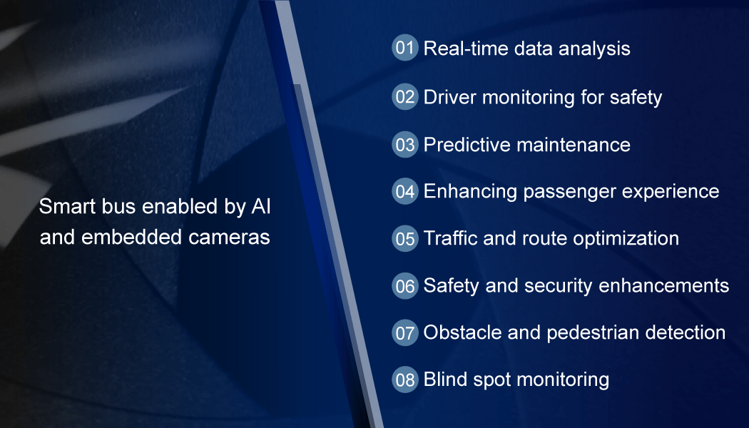 - Enhancing passenger experience: Cameras can capture passenger demographics and behaviors for processing by AI systems to display targeted advertisements on bus screens or adjust lighting/temperature based on the number and type of passengers on board.