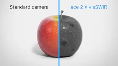 The Basler ace 2 X visSWIR camera allows for the detection of both visible and invisible light, enhancing the effectiveness of inspection processes. In this example, near-infrared (NIR) and short-wave infrared (SWIR) light penetrate the apple peel, revealing variations in moisture resistance, particularly in areas with higher water content. However, a successful SWIR vision system involves more than just this capability: