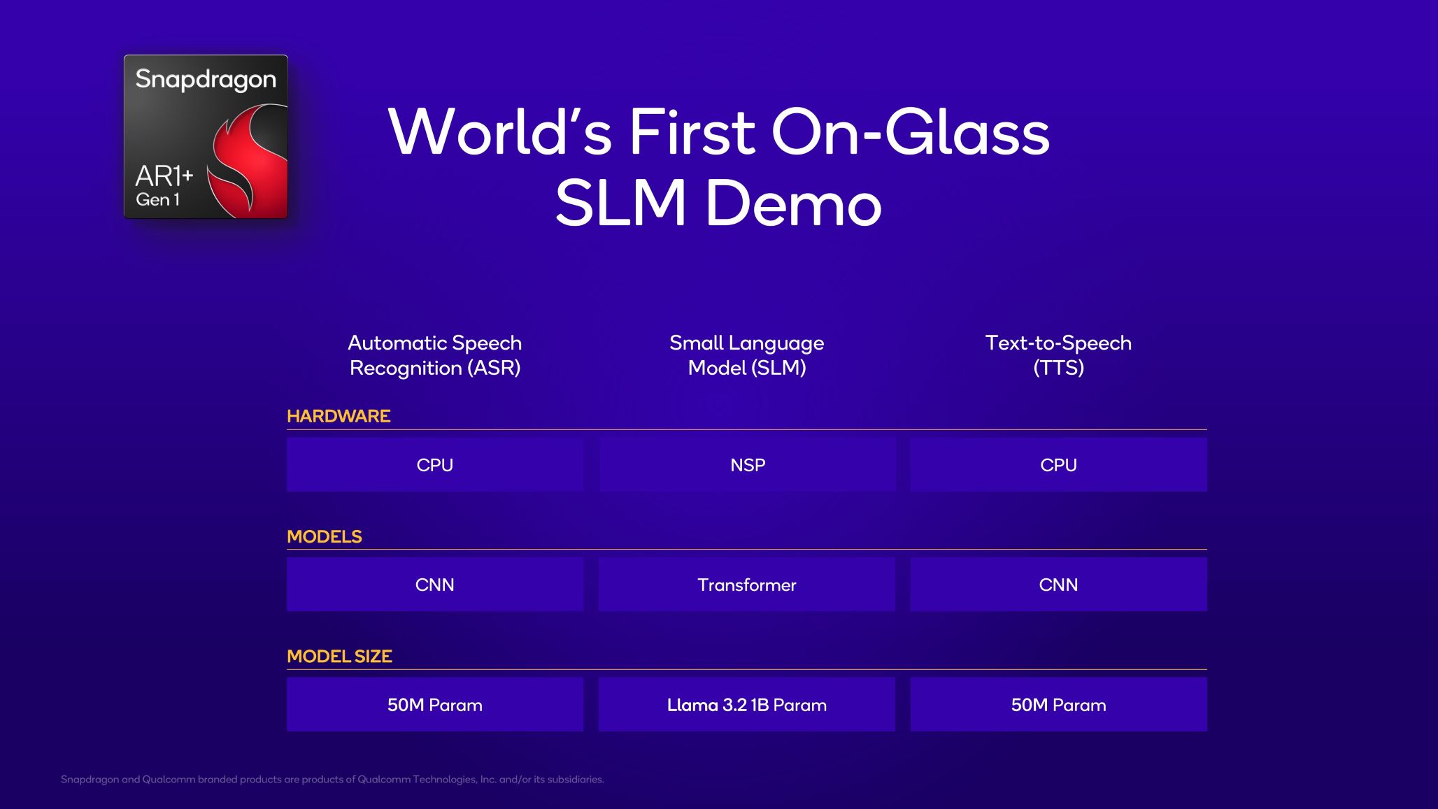 Topping this off was the announcement of our Snapdragon AR1+ Gen 1 processor, which is 26% smaller than the previous generations and brings enhanced image quality, size, power improvement and the ability to run SLMs. All four of these traits are critical for compact smart glasses.