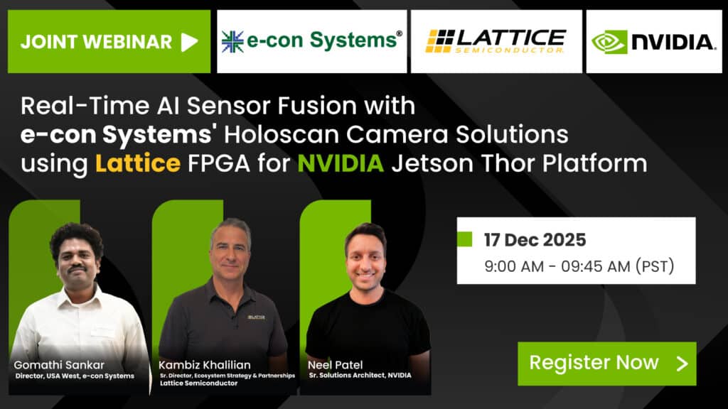 On December 17, 2025, at 9:00 am PST (12:00 pm EST), Alliance Member companies e-con Systems, Lattice Semiconductor, and NVIDIA will deliver a joint webinar “Real-Time AI Sensor Fusion with e-con Systems’ Holoscan Camera Solutions using Lattice FPGA for NVIDIA Jetson Thor Platform.” From the event page:
