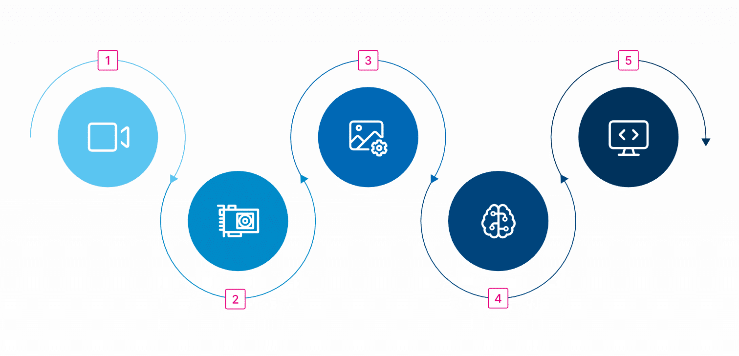 The process steps from image acquisition to the AI-supported decision: 1. Image acquisition | 2. Image transmission | 3. Pre-processing | 4. AI inference | 5. Result transmission