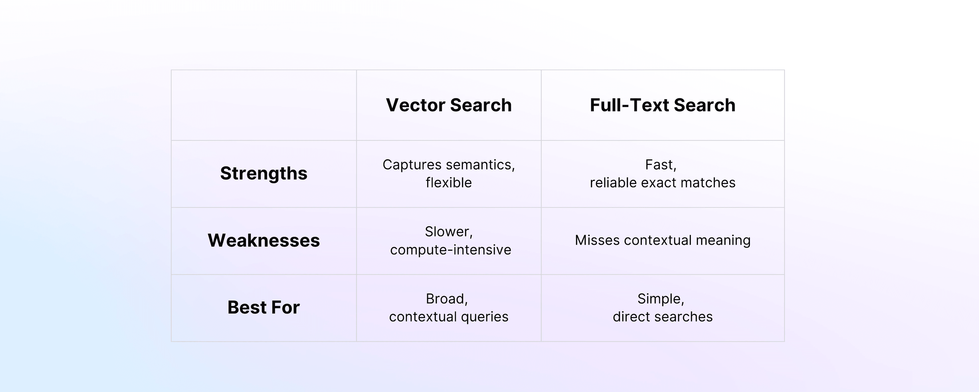 Matches exact phrases and keywords. It’s fast and efficient for literal queries but lacks contextual understanding.
