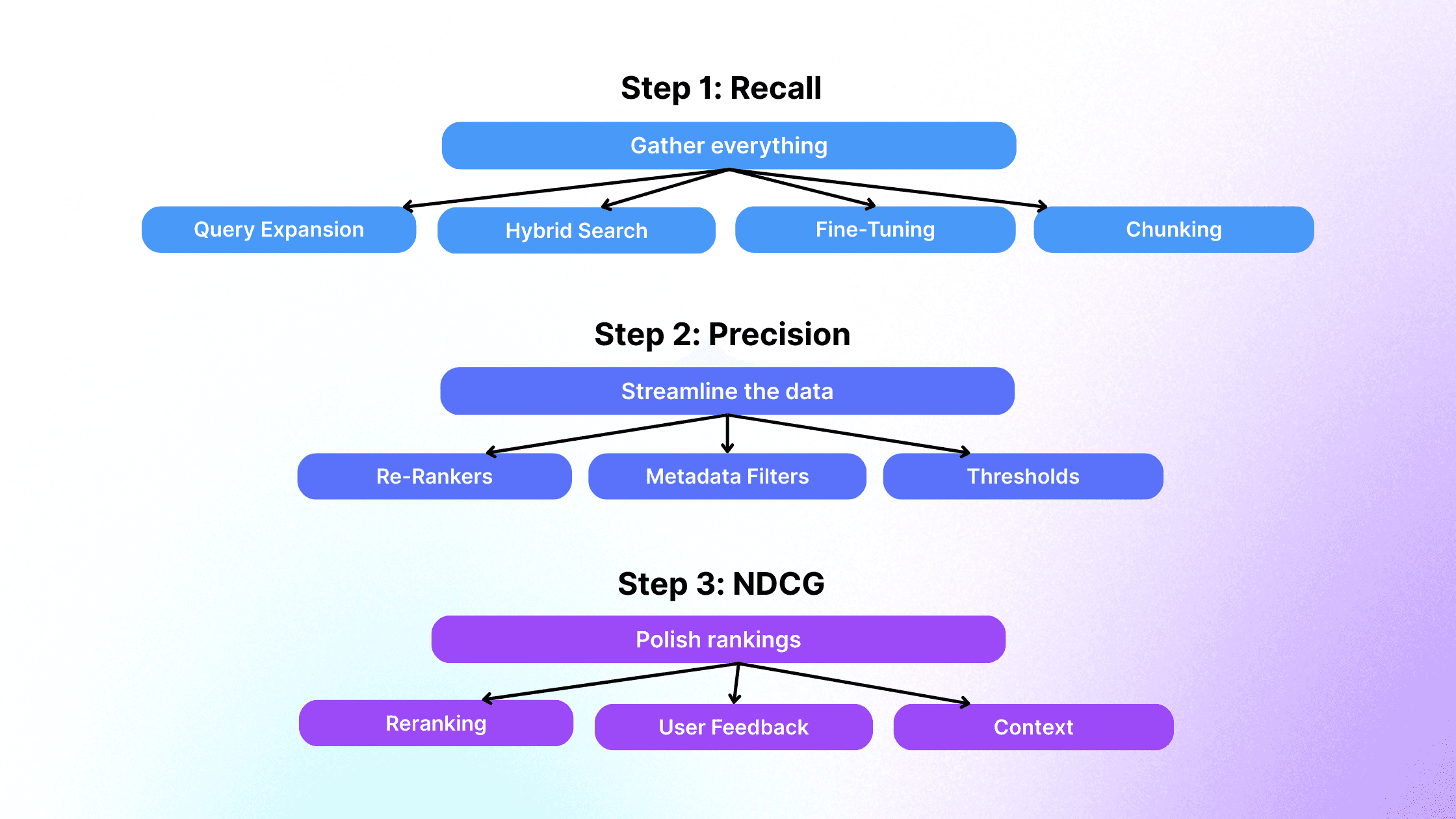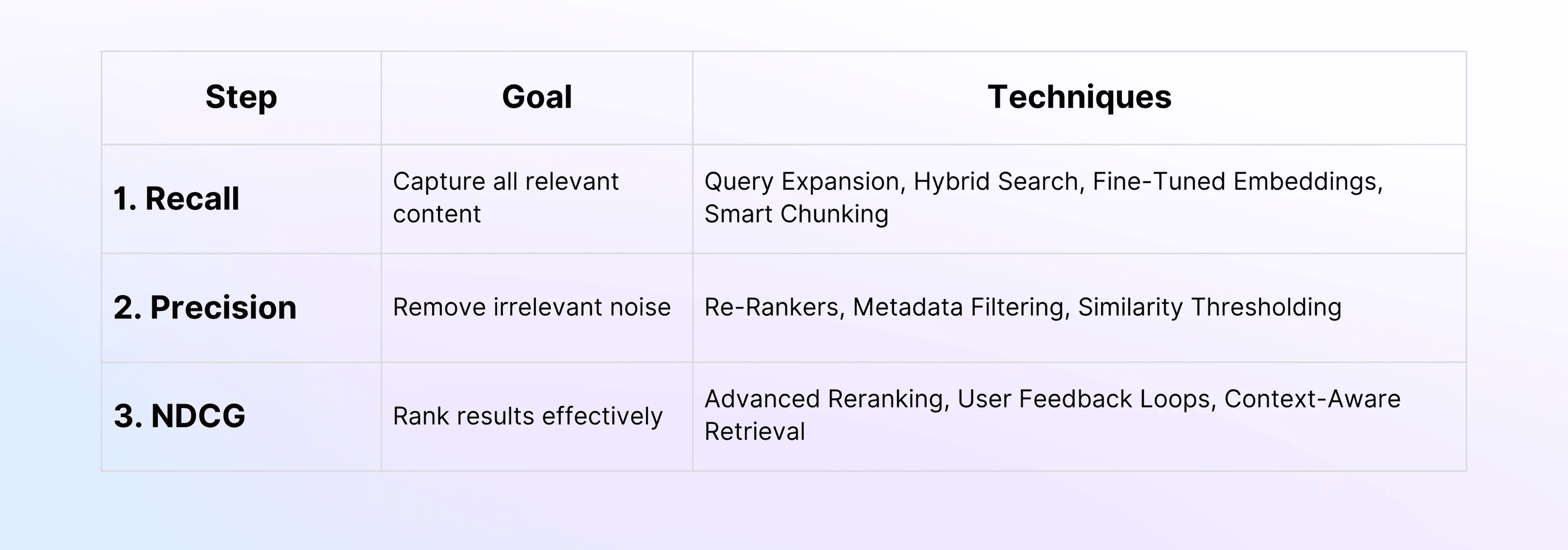 This guide outlines a step-by-step approach to optimizing RAG retrieval performance through targeted improvements in recall, precision, and NDCG (Normalized Discounted Cumulative Gain). It’s designed to help AI researchers, engineers, and developers build more accurate and efficient retrieval pipelines.