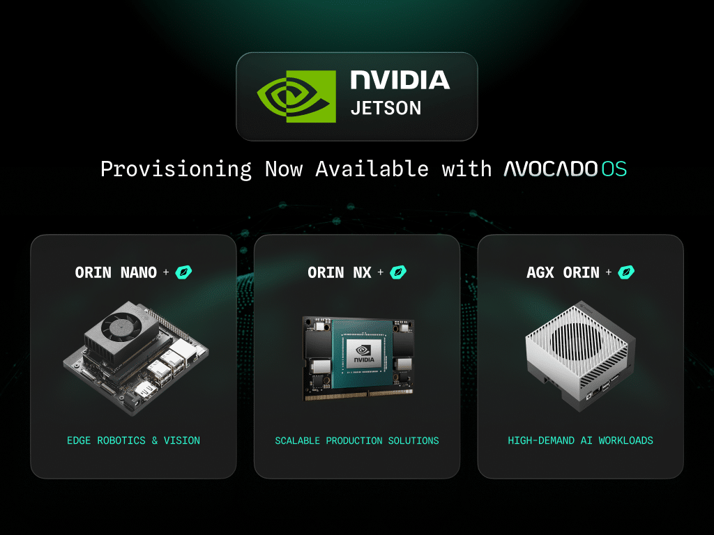 Today, we’re announcing native provisioning support for NVIDIA Jetson Orin Nano, Orin NX and AGX Orin in Avocado OS. This completes our production software stack for the industry’s leading AI edge hardware, delivering deterministic Linux, secure OTA updates, and fleet management from day one.