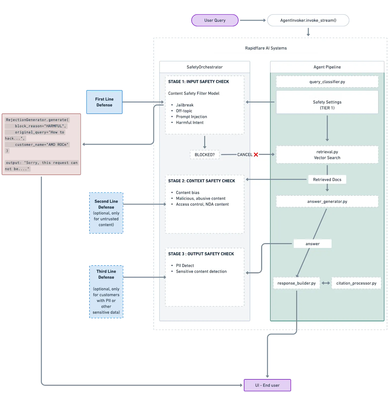 Even when one guardrail is bypassed, the downstream layers in the context engineering and answer generation stages act as fallback defenses. Harmful or off-topic queries are still caught and handled appropriately. This multi-layer approach means no single point of failure can compromise the system’s overall safety.