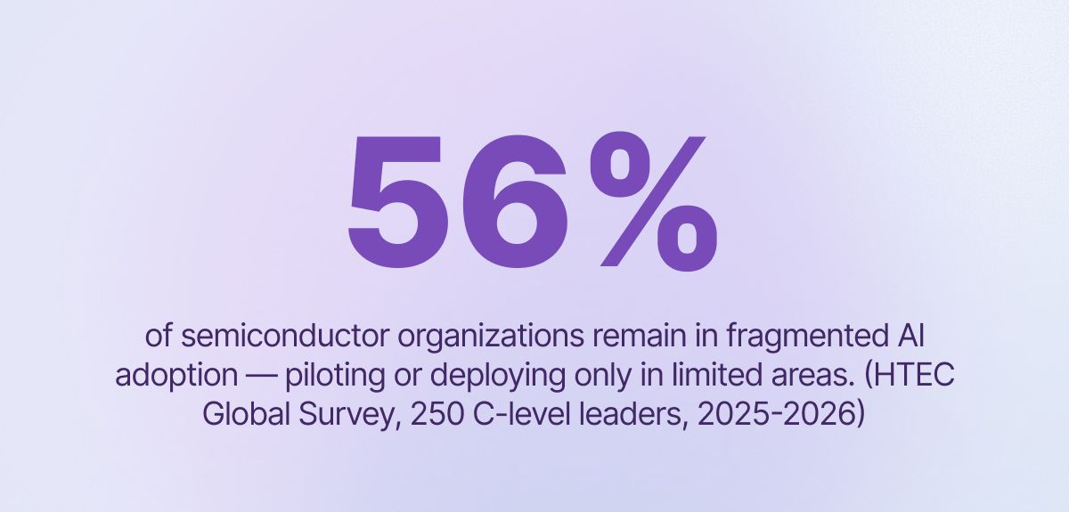 AI chips are now 0.2% of all chips manufactured, but they account for roughly 50% of total industry revenue1. This ratio reflects current semiconductor trends. AI is already reshaping chip design cycles, manufacturing yield optimization, and deployment architectures. Yet according to HTEC’s global survey of 250 C-level semiconductor leaders, only 44% of organizations have fully embedded AI across multiple functions, while the remaining 56% are still operating in pilots, limited deployments, or early exploration. The enterprise-wide AI integration is not yet in place. Based on insights from the survey and expert commentary from Craig Melrose and Ian Baird, senior semiconductor leaders at HTEC, several trends are set to define the semiconductor landscape in 2026.