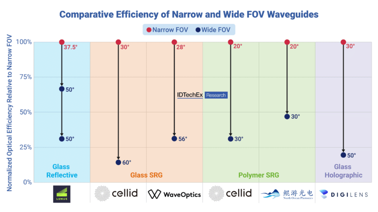The difference in optical efficiency at wider FOV for the same technology type for several commercial waveguides. Data was normalized to the narrow FOV product, with arrows representing the reduction in efficiency for wide FOV waveguides developed by the same company. A clear reduction in optical efficiency for waveguides of the same technology at wider